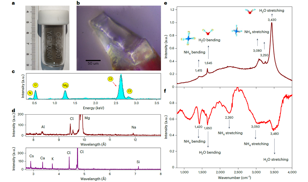 科研人员此次对嫦娥五号月球样品进行了精细的单晶衍射和化学分析,在其中发现了一种富含水分子和铵的透明晶体,水分子的质量...