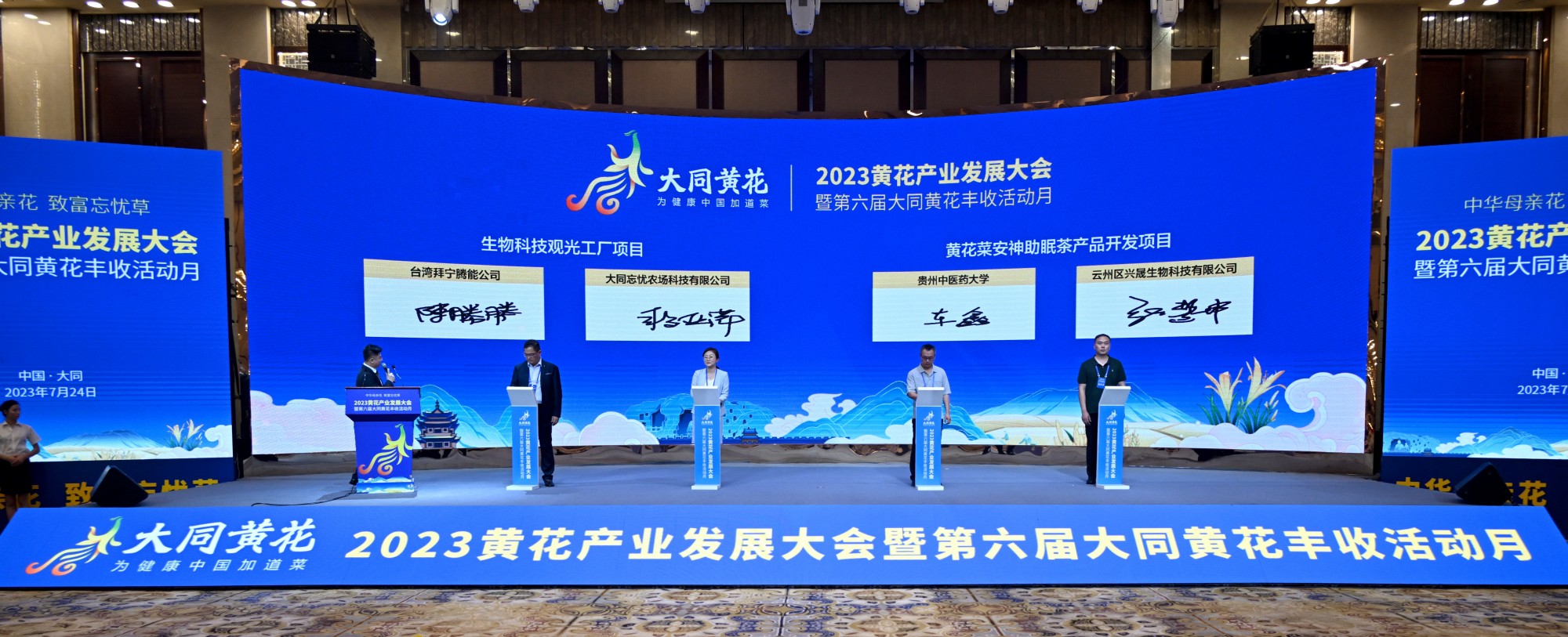 大同黄花,由于生长在独特自然条件的黄土高原、火山岩壤、北纬40度冷凉气候黄金带,造就了其蕾长肉厚、色泽金黄、脆嫩清香的特色品质。在大会授牌仪式上,中国蔬菜流通协会授予大同市为“中国黄花之都”,进一步凸显了“大同黄花”这块特色农业“金字招牌”和“城市名片”效应。在项目建设签约仪式上,大同市人民政府与深农集团、北京供销社分别签订战略框架协议。台湾拜宁腾能公司与大同忘忧农场,贵州中医药大学与云州区兴晟生物科技有限公司将分别就黄花生物科技工厂建设项目和黄花安神助眠茶开发项目签订合作协议。这些重点项目的签约为政府与企业、企业与企业搭建合作共赢的桥梁,共同推动黄花产业向规模化、标准化、产业化转型升级,进行深度开发加工,延伸产业发展链条,提升大同农业高质量发展水平。