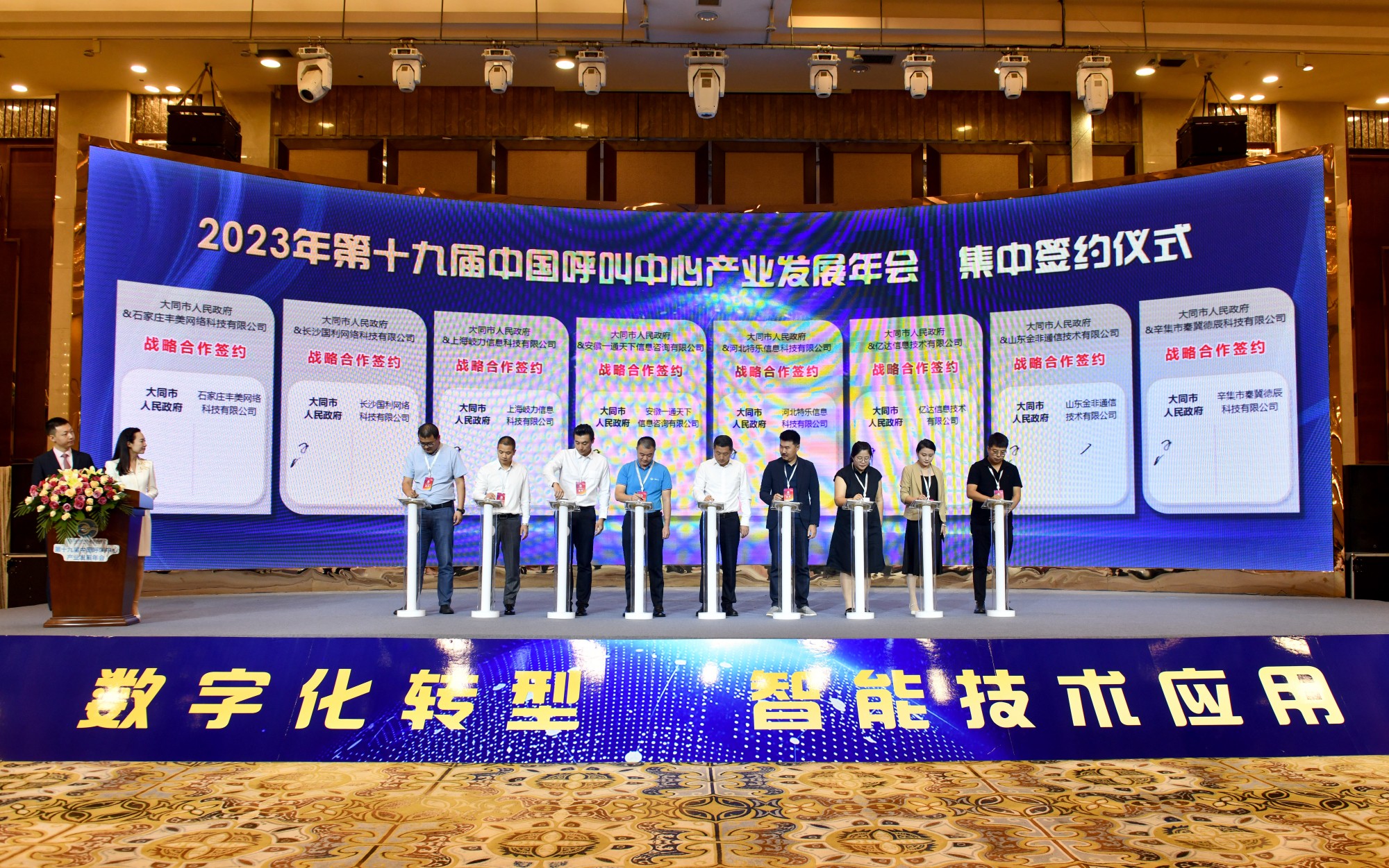在“2023年第十九届呼叫中心产业发展年会”开幕式上,大同市人民政府分别与石家庄丰美网络科技有限公司,长沙国利网络科技有限公司、上海岐力信息科技有限公司、安徽一通天下信息咨询有限公司、河北特乐信息科技有限公司、山东金非通信技术有限公司、辛集市秦冀德辰科技有限公司、亿达信息技术有限公司签订了战略合作协议。会议期间,还举行了题为《“5G+北斗”融合发展机遇与挑战》《电子皮肤在人机交互及元宇宙中的应用》《运营商在呼叫中心业务中的实践》等主旨主题演讲活动,热情洋溢、精彩纷呈的演讲博得现场现众阵阵掌声。