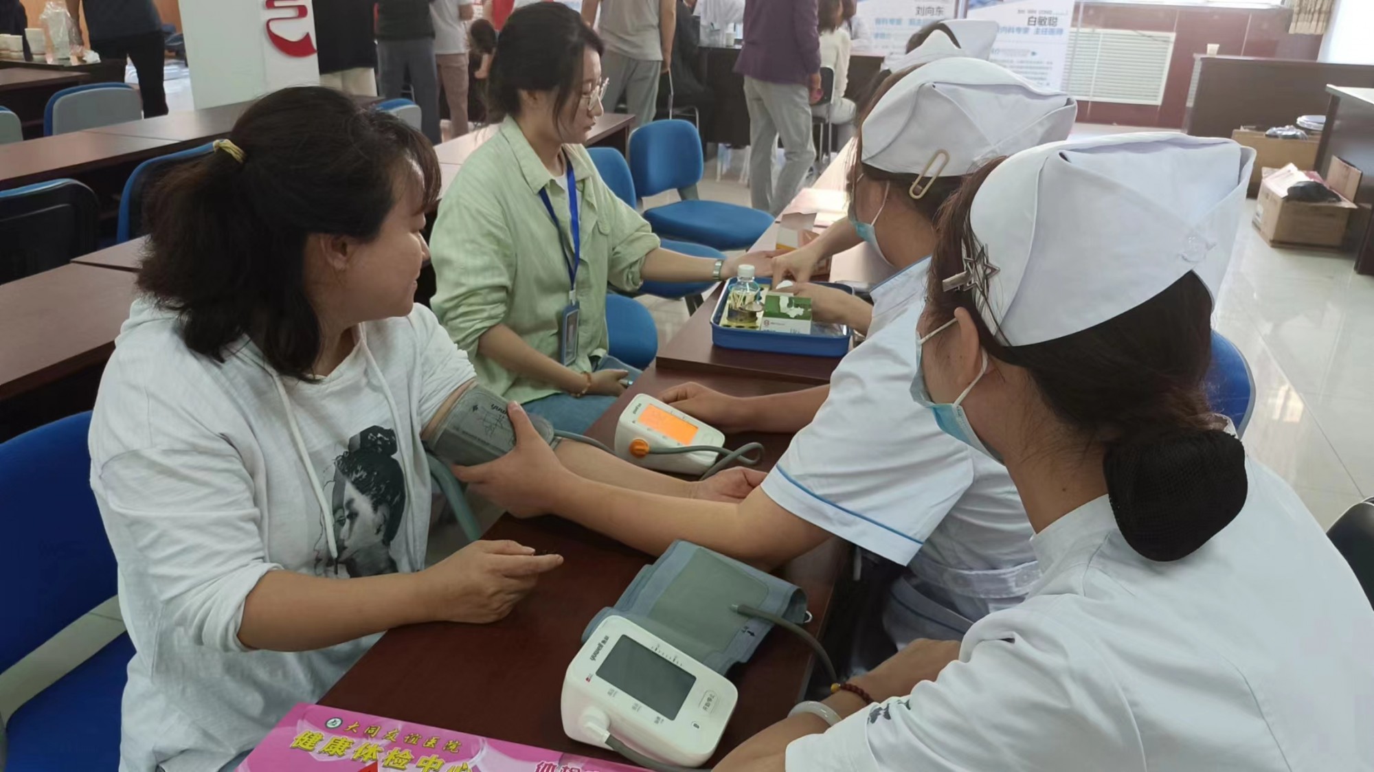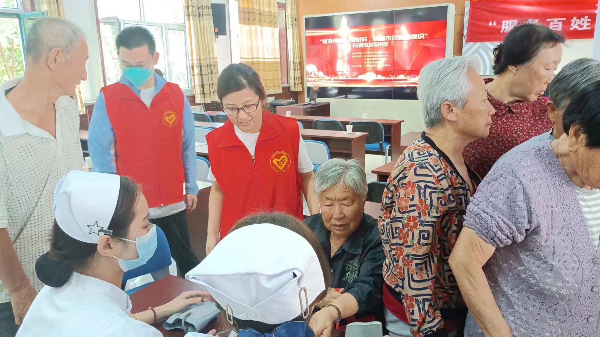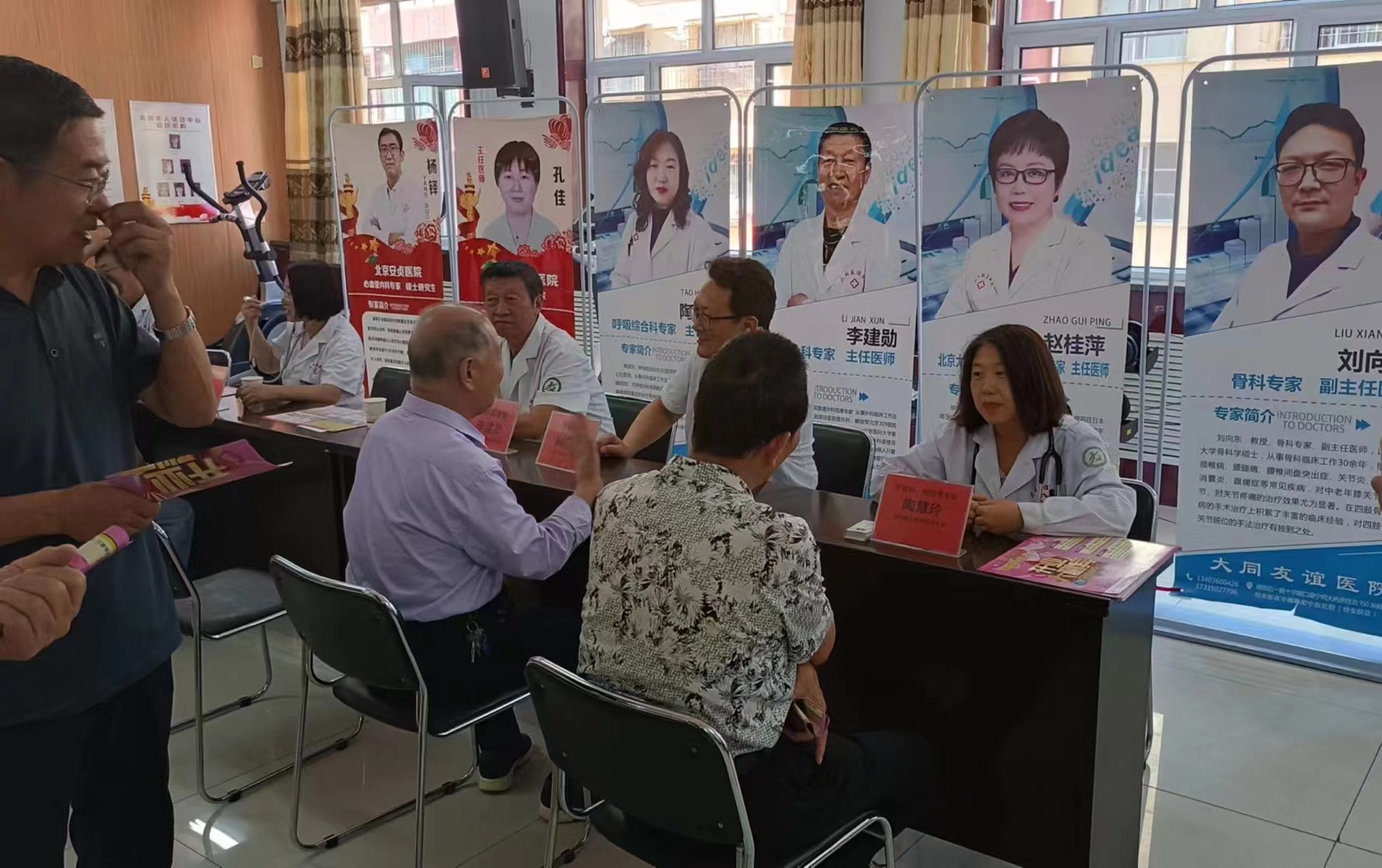 讲座后,在社区和大同市友谊医院的配合下,大同三医院首席退休专家,骨科专家,同煤总医院原内科心内科主任、大同大学健康顾问等专家对社区群众进行了详细的病史询问,给予专业的治疗意见;护士为义诊群众测血糖血压等,并进行健康指导。