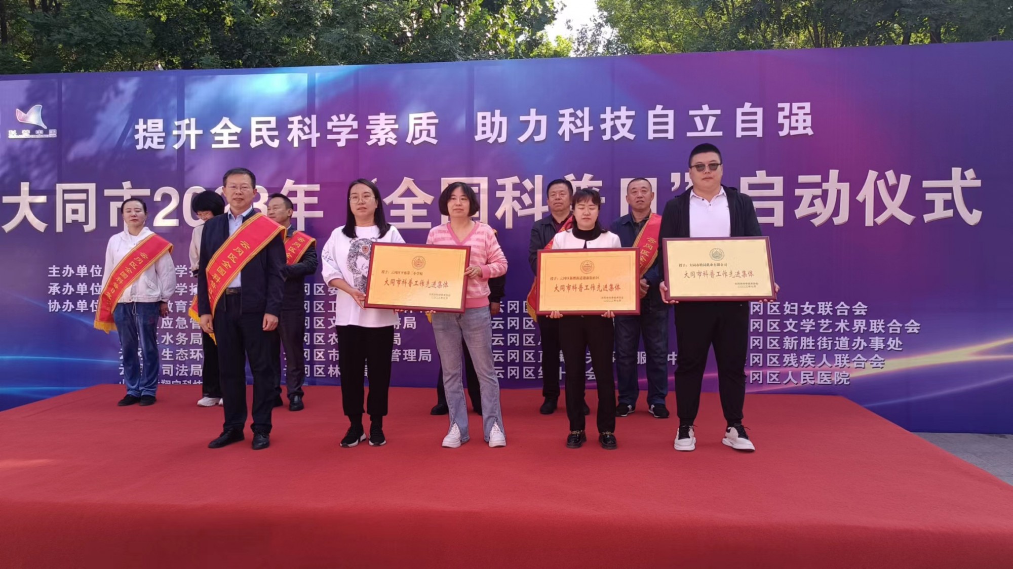 大同市科协主席王正忠,云冈区人大常委会主任刘巨平,大同市科协副主席李成斌,云冈区科学技术协会主席赵东海,大同市科协四级调研员丁丽英,云冈区人民医院党总支书记、区科协兼职副主席高升平,新胜街道办事处主任高建华出席仪式;云冈区司法局、生态环境分局、农业局、残联、工信局、文旅局、教科局、街道等多个成员单位积极参加。