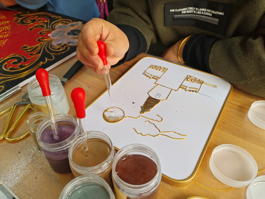 近年来,葛春芳从自己做到带动大家一起做,培训了一批批喜爱掐丝珐琅的非遗文化爱好者。掐丝珐琅画通过国家级非遗项目景泰蓝工艺汲取并创新了掐丝、点蓝等工序,掐丝珐琅无需制胚、烧制和打磨,只需将密石以及矿物粉末代替法琅填充到掐丝间格内,摆脱了设备限制,降低了工艺难度的同时不影响画面效果,还拓宽了创作载体的各种可能。