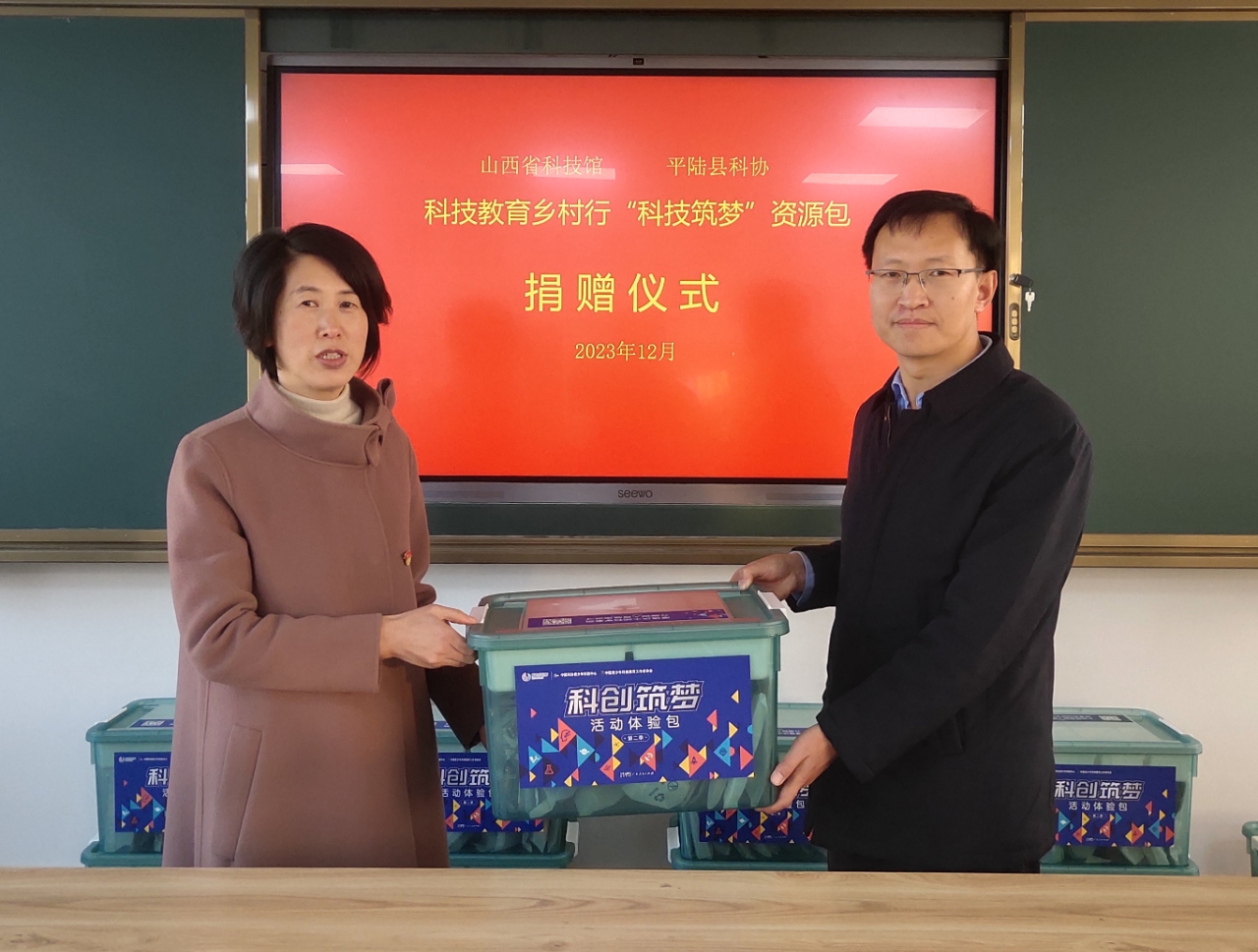 ▲山西省科学技术馆、平陆县科协向平陆县第一小学赠送“科创筑梦”资源包