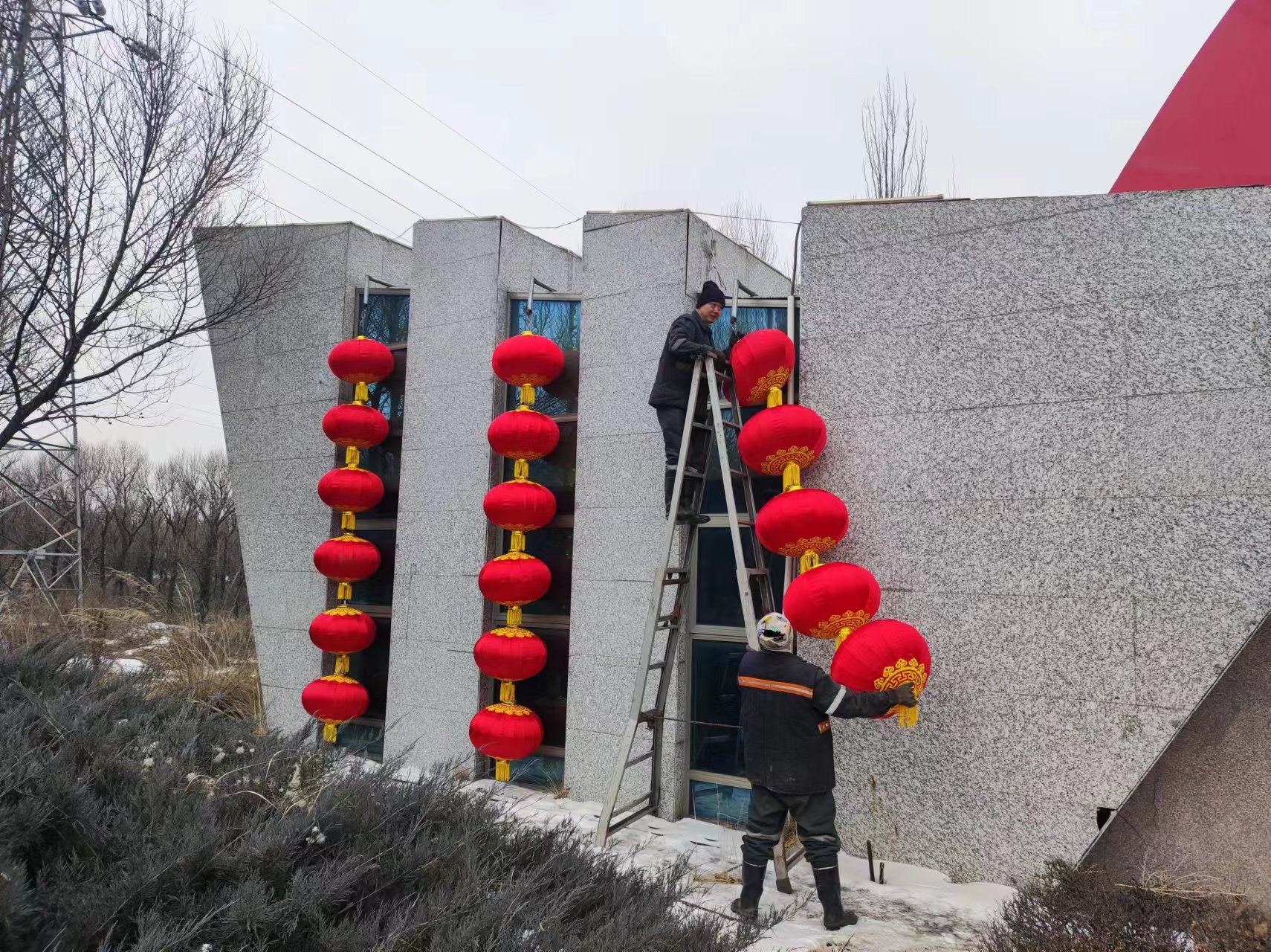 他们在1号公路两旁整齐地悬挂起大红灯笼,点亮矿山第一道风景线,在主干道两旁的树上挂上五颜六色的灯串,打造“火树银花”的视觉效果,在工业广场花坛上方搭起架子,用彩灯拼出“平安”二字,表达平安祥和、万事顺遂的美好寓意。公司工会向各个区队发放了大红灯笼248个,春联839副,窗花880幅,要求各单位员工在年前将这些灯笼、春联、窗花红红火火地张挂起来,使平日严肃的工作环境瞬间显得喜气洋洋。
