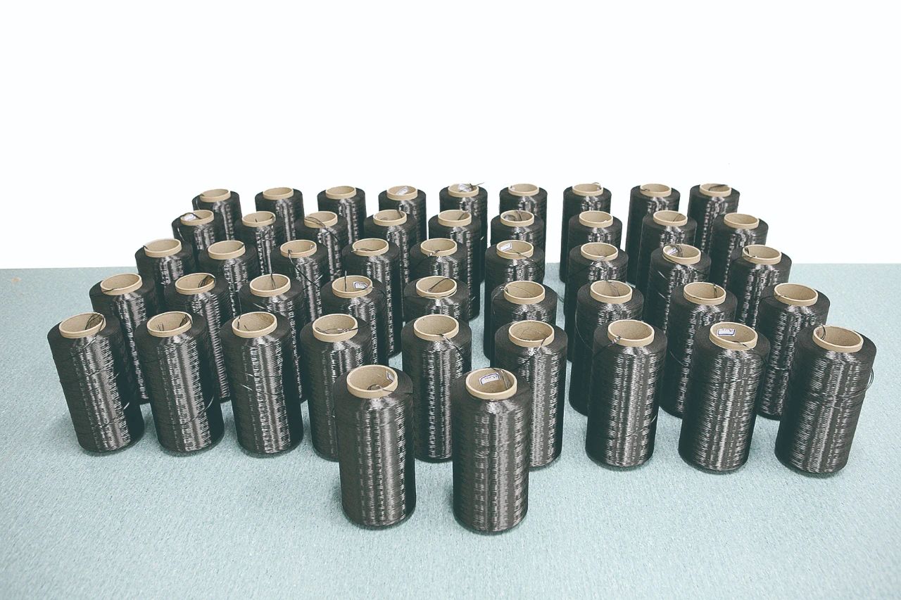 洁净的厂房里,高性能碳纤维生产线一刻不停地高速运转着。 透明的聚丙烯腈纺丝溶液,穿过有成千上万个微米级小孔的喷丝板,喷出的白丝被数不清的轮子拉扯着向前,穿过蒸汽、蹚过油剂,再穿过烘干机,越扯越细,直到每根丝如羊毛一般。 之后,白丝被运到另一条生产线上,继续被轮子拉扯向前。数百摄氏度的氧化炉,让白丝变得焦黄;上千摄氏度的碳化炉,又让黄丝变得乌黑。千锤百炼后,“人工羊毛”变成了“黑色黄金”,成为航空航天尖端装备中一种不可或缺的材料——高性能碳纤维。