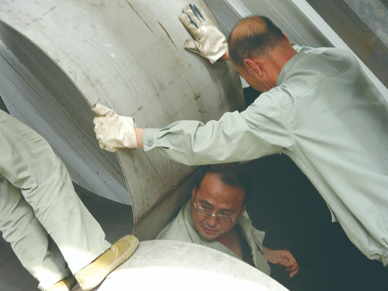 一个多月后,科研团队将小店工程化试验线上生产的原丝,运到扬州新建成的氧化碳化线上,生产出第一批T300碳纤维。 氧化碳化线建设完成后,原丝生产线的建设就成为项目团队要破解的最关键难题,而大容量聚合釜则是让吕春祥等人最挠头的问题之一。 聚合是碳纤维制备的第一个化学反应工序,聚合釜是聚合反应用的“锅”。在中试阶段,为了保证聚合釜能稳定产出性质一致的聚丙烯腈纺丝溶液,吕春祥摒弃了传统聚合釜的连续聚合工艺,颠覆性地设计并采用了间歇聚合工艺。 “原丝性能要高,就好比熬一锅粥,不仅不能煳锅,还必须保证每粒‘米’的生熟度一致。连续聚合是连续不断地进料、不断地煮,容易煳锅,如原料不均匀,过滤器也容易堵,每3个月就要清洗一次;间歇聚合则是一锅一锅煮,煮好了放到罐子里,然后纺丝,不仅原料均匀稳定,而且过滤设备可以多年不清洗。”吕春祥说。 实际上,聚合反应釜的研制和反应控制要比锅里煮饭复杂得多,它对材质、形状、耐压、防爆、搅拌、温控等方面的要求都非常苛刻。在工程放大过程中,这种国内前所未有的新工艺聚合釜,遇到了前所未有的挑战。聚合反应的原料丙烯腈是甲级防爆高毒物,在聚合过程中会发生强放热反应,聚合釜容量增加后,防爆能力也必须增强。因此,聚合釜的容量越大,设计难度也越大。 怎样才能让聚合釜既有大容量,又能安全稳定?吕春祥等人没有可借鉴的经验,只能一步步摸索。顶着巨大的压力,他拿着设计方案请高分子化工、高分子物理、流变学、反应动力学、传质传热、自动控制、化工设备等多学科和专业领域的专家反复论证,确保方案科学合理。 5月25日一早,聚合釜投料。吕春祥一天一夜没合眼。 5月26日一早,身在太原的孙予罕发短信问吕春祥:“聚合怎么样?”
