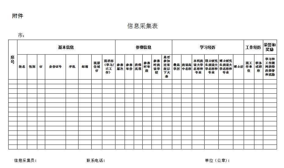 (二)根据各市往届科技竞赛参与情况,太原市上报获奖学生(含省赛)信息不少于40人,获奖科技教师信息不少于10人;晋中、忻州、阳泉、长治各市上报获奖学生(含省赛)信息不少于20人,获奖科技教师信息不少于5人;大同、朔州、吕梁、临汾、晋城和运城各市上报获奖学生(含省赛)信息不少于5人,获奖科技教师信息不少于5人。同时,将工作信息采集表(见附件)于5月6日前发送至690650415@qq.com.