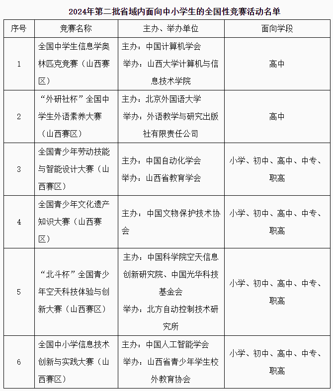 根据《教育部办公厅关于公布2022—2025学年面向中小学生的全国性竞赛活动的通知》《山西省教育厅等四部门关于印发〈面向中小学生的全省性竞赛活动管理办法〉的通知》和《山西省教育厅关于做好面向中小学生的全国性竞赛活动管理工作的通知》精神,在有关单位报备的基础上,经我厅审核并与主办单位核实,拟确认全国中学生信息学奥林匹克竞赛(山西赛区)等6项竞赛活动为2024年第二批省域内面向中小学生的全国性竞赛活动。现将名单予以公示,公示期为2024年5月9日至5月14日。