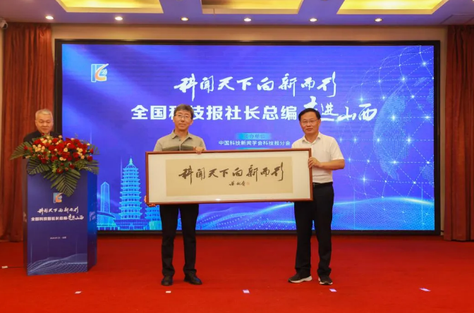 山西省书协理事、山西省保险学会秘书长梁兴国为中国科技新闻学会科技报分会赠送墨宝“科闻天下 向新而行”。中国科技新闻学会科技报分会副理事长、山东省创新战略发展研究院首席编审李志全接受墨宝。