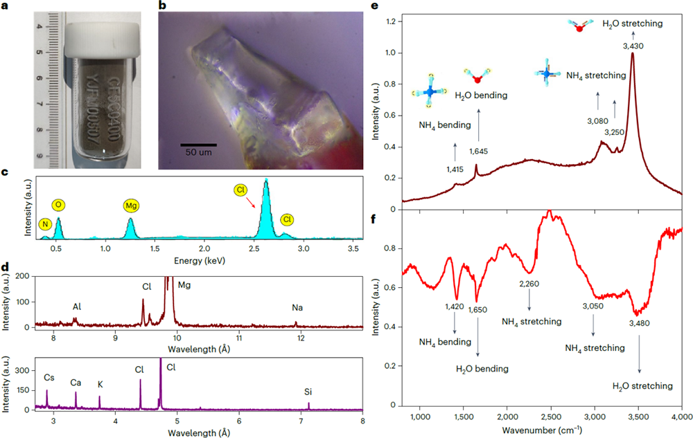 科研人员此次对嫦娥五号月球样品进行了精细的单晶衍射和化学分析,在其中发现了一种富含水分子和铵的透明晶体,水分子的质量占该矿物总质量的41%。科研人员还分析了该矿物的同位素成分和形成条件。结果表明,该矿物的氯同位素组成和月球样品相近,不是来自地球污染或火箭尾气。
