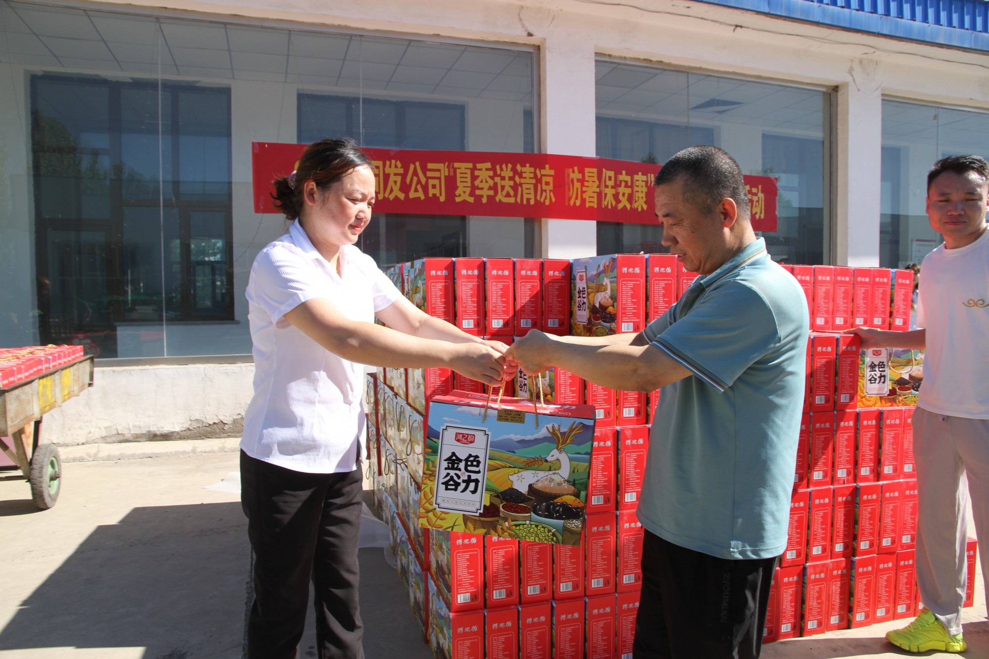 活动现场,工会工作人员将茉莉花茶、河之韵金色谷力杂粮礼盒、蜜芝王槐花蜜关爱慰问品等防暑降温物品送到员工手中。并嘱咐员工夏季高温作业时要多喝水,注意防暑降温,增强员工防暑降温意识。