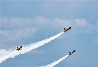 开幕式上,三架歼10模型机编队飞行表演。戎禹仁摄