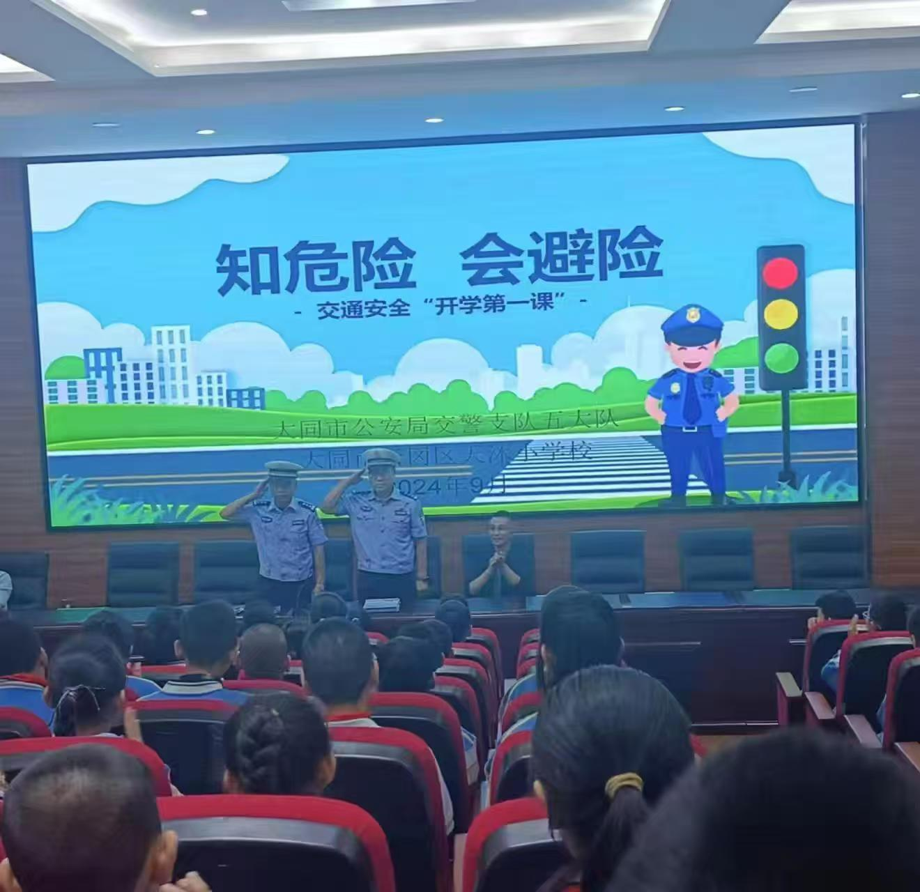 大同市交警支队五大队副队长王玉江、宣传股股长侯文胜,天沐小学校孟校长全程参加参加本次安全教育活动。