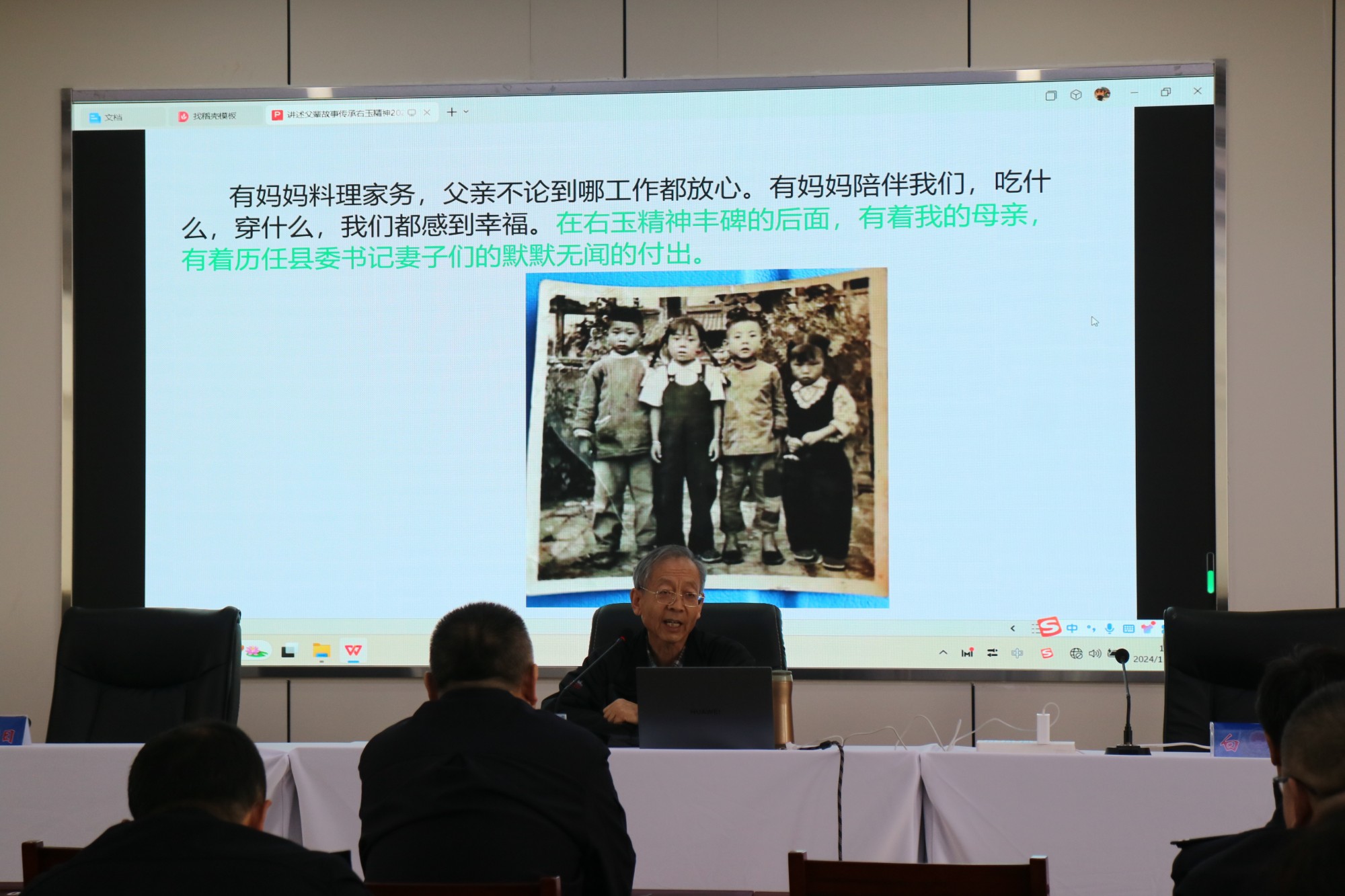 在应县交警队,关原成教授以“讲述父辈故事 传承右玉精神”为主题,结合父辈们的生活、工作的故事,详细解读了右玉精神。他指出,右玉精神不仅仅是为了风沙住、为了地皮绿、为了肚子饱的种树活动,更是老一辈基层领导工作态度和工作作风的具体表现,是从育苗、育林到育人的精神力量。右玉精神体现的是一代又一代右玉人持之以恒地为改善生态环境不懈努力,几十年如一日坚持植树造林,最终让荒沙地变绿洲。
