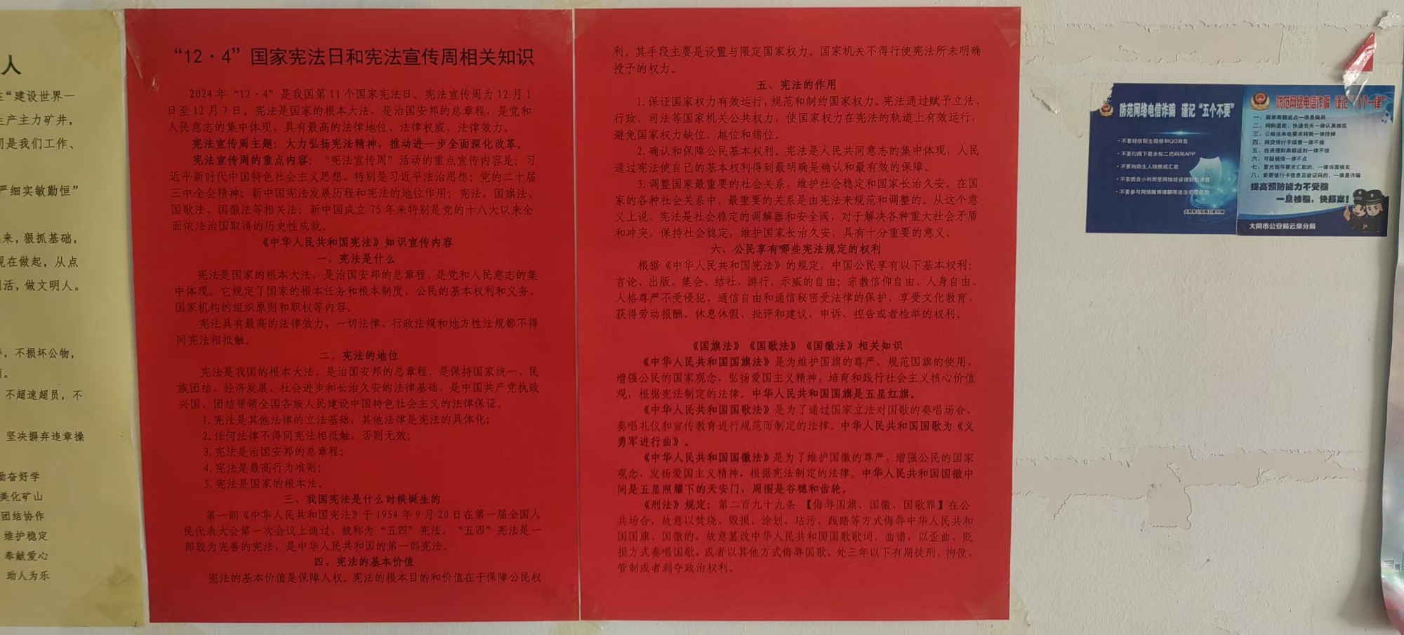 今年12月4日是全国第11个国家《宪法》宣传日,晋能控股煤业集团同发东周窑煤业公司党委提前筹划,周密安排,从11月29日开始,他们提前开展宣传活动,确保形成上下联动、共同参与、整体推进的宪法宣传教育格局,不断推动宪法宣传教育取得实效。