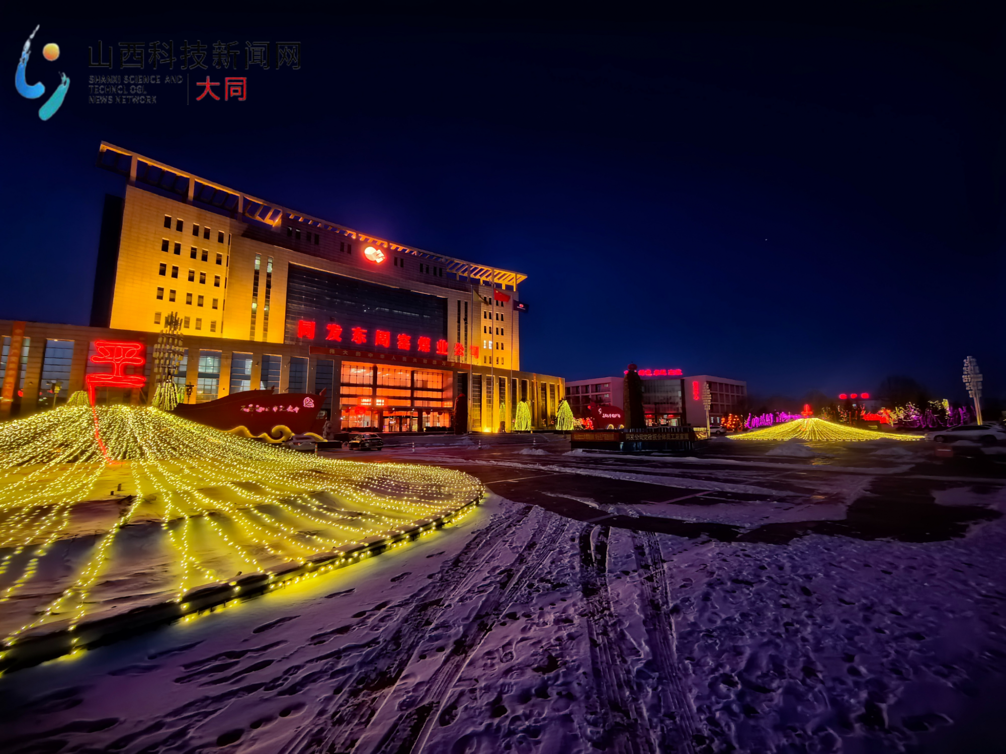 夜幕下,站在一号公路上,一排排红色福字灯、一串串七彩霓虹灯将同发东周窑煤业公司公司映衬得更加流光溢彩、熠熠生辉;宛如繁星的彩灯缠绕在树枝上显得格外的妖娆妩媚,寓意着点亮今天、照亮明天、迎接未来。(张震 康健)