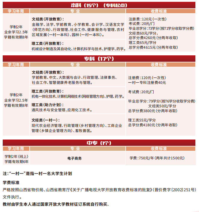 本着“人人皆学、处处能学、时时可学”的理念,采用“线上+线下”融合的学习方式,有效解决学生工学矛盾,轻松实现工作学习两不误。学生自主学习,参加形成性考核和终结性考试。本科各专业开放的英语、计算机应用基础两门课程,不参加教育部统一组织的考试;其他课程由山西开放大学统一组织,在各分校及教学点完成教学考试任务。