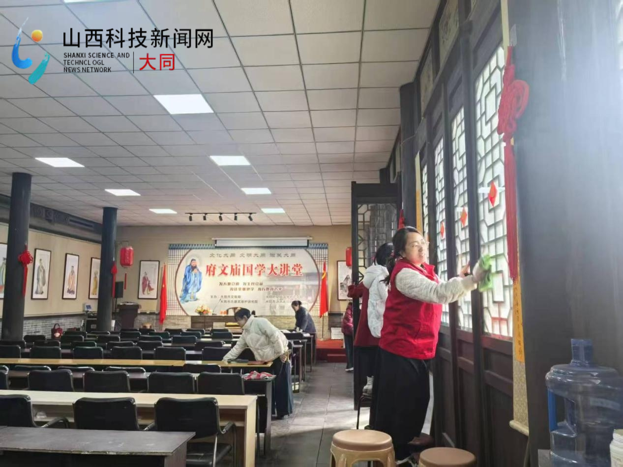 近日,平城区妇联携手10组家庭志愿者走进历史悠久的文庙,共同开展了一场别开生面的清扫行动。志愿者们手持清洁工具,迅速投入到紧张而有序的清扫工作中。他们分工明确,有的志愿者手持扫帚,一丝不苟地清扫着文庙各个角落的落叶和灰尘;有的则拿着抹布,细心擦拭着碑刻、栏杆和陈列展柜,让古老的文化遗迹焕发出新的光彩。