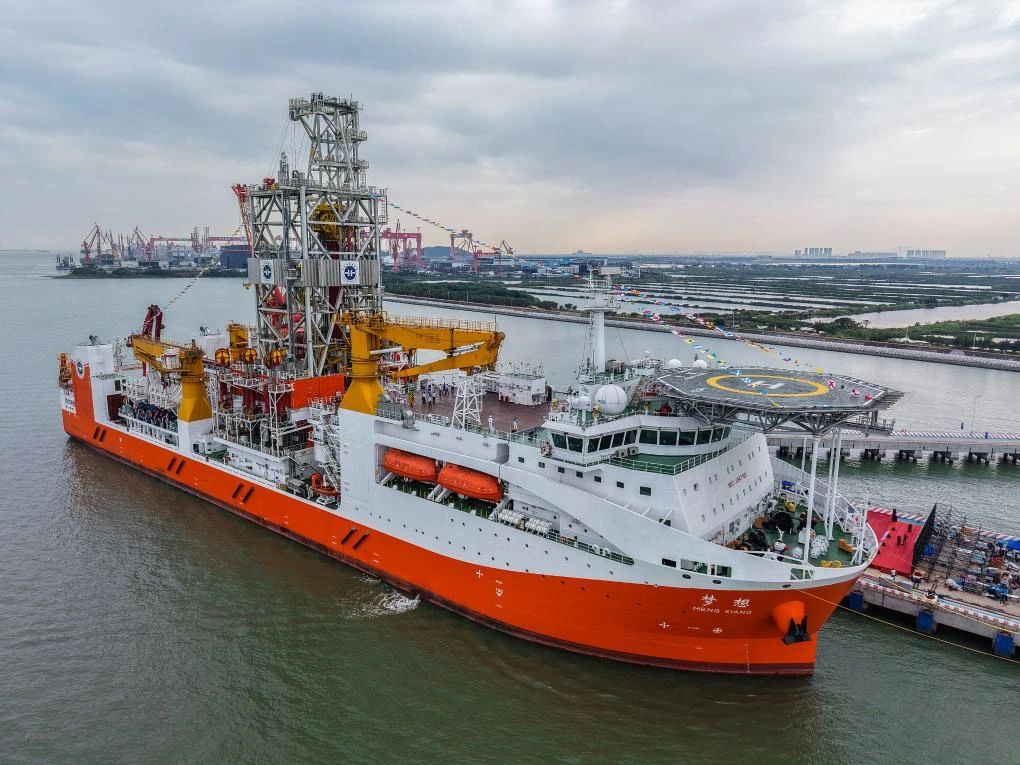▲我国自主设计建造的首艘大洋钻探船“梦想”号(无人机照片)。新华社记者 刘大伟 摄