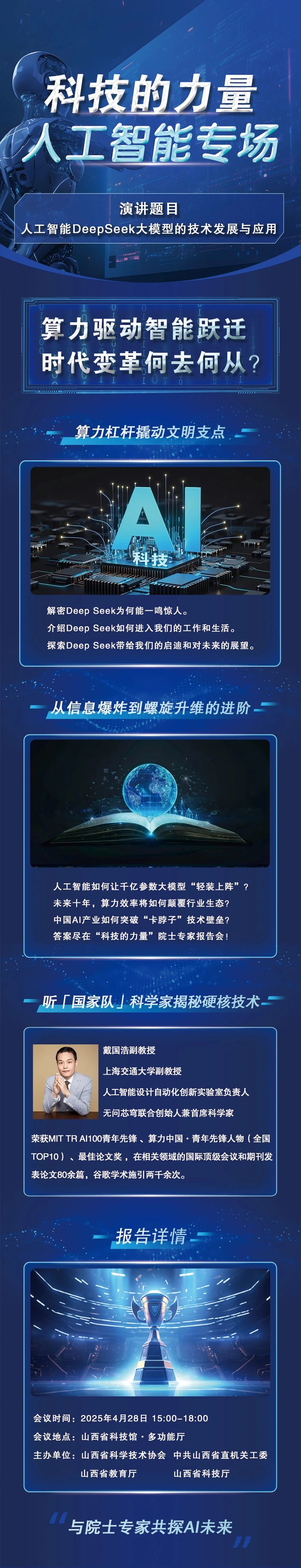 陈小平教授将围绕“人工智能的原理性突破:从科技到社会”展开深入讲解,带领听众探寻人工智能从理论到实践的跨越之路,以及它对社会产生的深远影响。周程教授将聚焦“人工智能时代的脑机接口技术创新”,揭示这一前沿科技如何改变人类与机器的交互方式,为未来科技发展开辟新的可能。戴国浩副教授则以“人工智能DeepSeek大模型的技术发展与应用”为题,分享该大模型在技术层面的突破以及在各领域的实际应用案例。