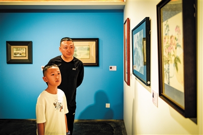 图为一对父子沉浸在经典绘画特展的艺术氛围中。