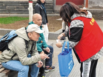 古城街道志愿者为吸烟游客发放灭烟袋。
